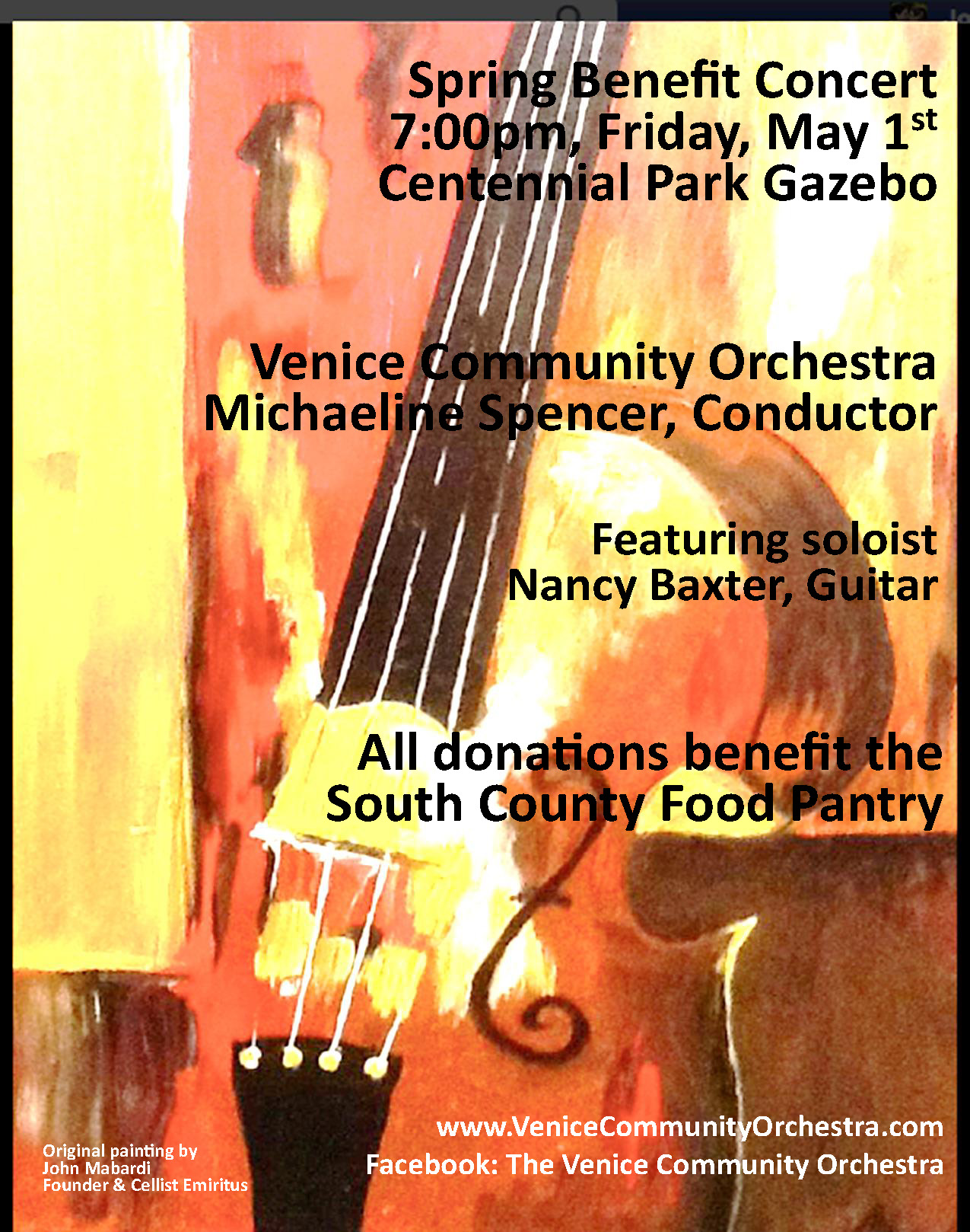 Venice, Florida, April 2026 – VCO’s Spring Benefit Concert will be Friday, May 1st at 7pm and take place at Venice’s Centennial Park Gazebo. Selection will include pieces by Rodagers & Hammerstein, Joplin, Puccini, Dylan, Coldplay and from Les Miserables. All donations will benefit the South County Food Pantry. Please join us for this wonderful evening bringing music & charity to our community.